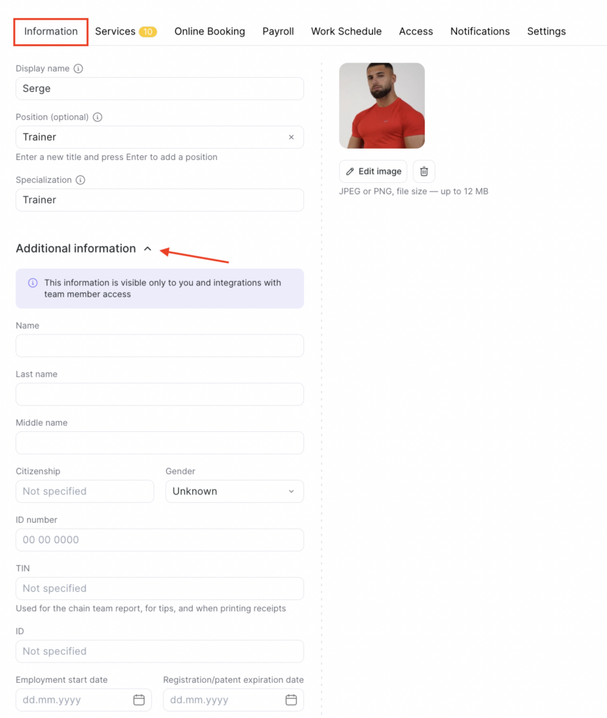 Select a team member and click their name. On the first Information tab, expand the Additional information section and fill in the required fields.