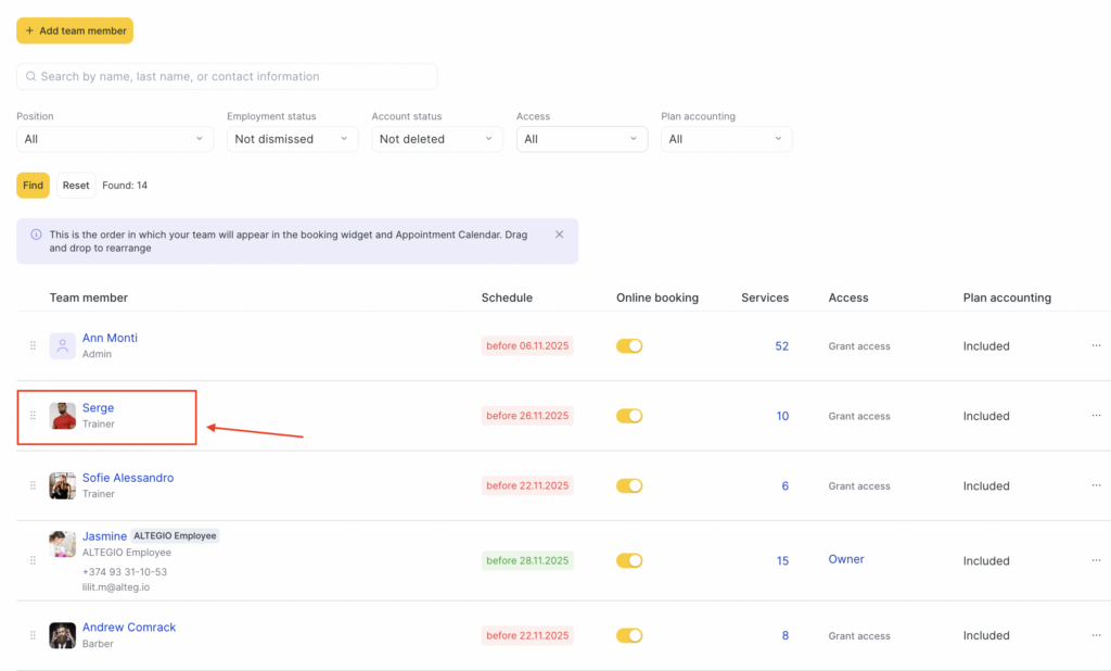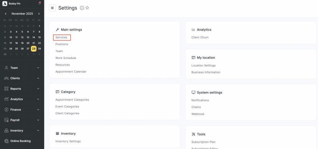 - In Settings > Main settings > Services. This option is more convenient if your company has few services and many team members; a detailed description is available in the article at the link.