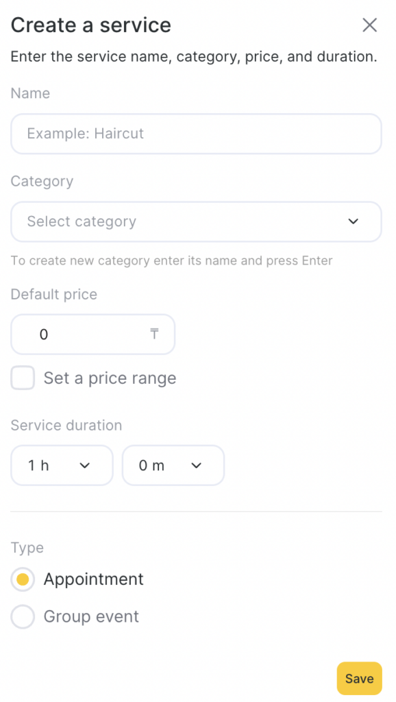 Fill in the required fields such as Name, Category, Default price, Duration, and Service type, then click Save to apply the changes.