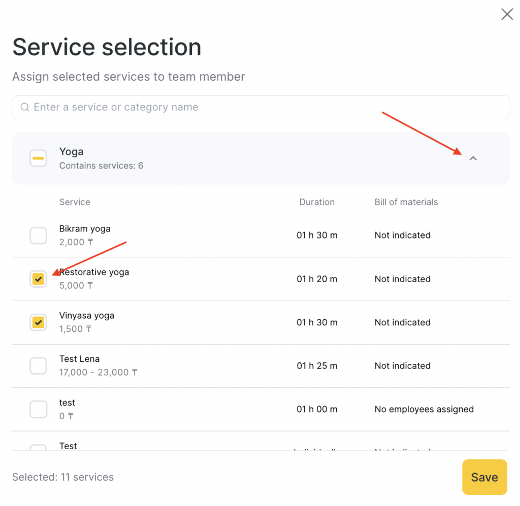 In the modal window that opens, click the category name and check the box next to each service you want to assign to the team member. You can assign all services at once by checking the topmost box.