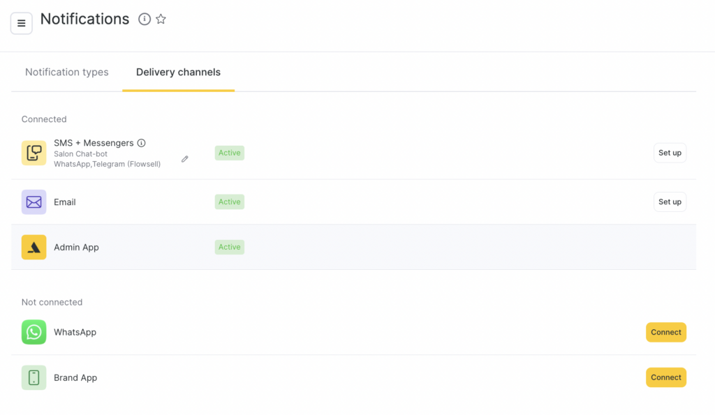 After configuring and connecting the required delivery channels, set up notification types for administrators and team member in Settings > System settings > Notifications > Notification types.