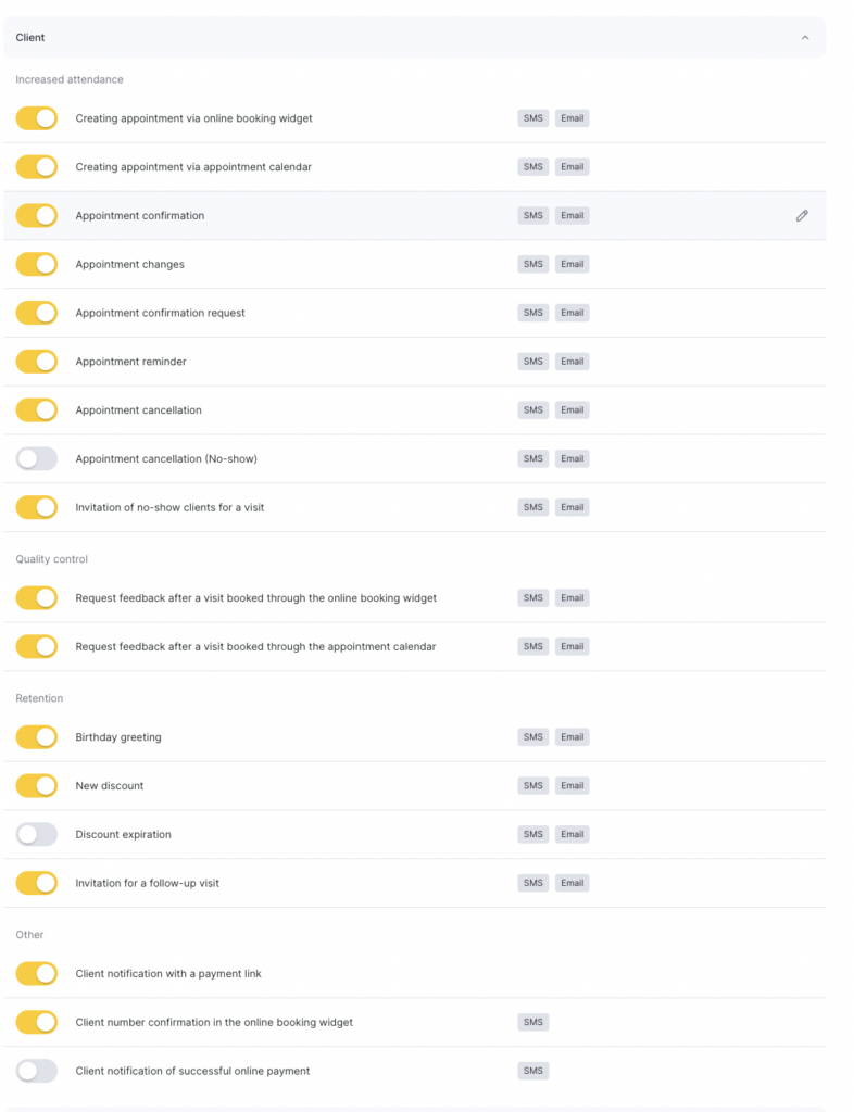 Client data. If you uncheck “Send the client’s name and phone number”, the team member will not receive the client’s contact details in SMS, email, and push notifications, but will still receive all other appointment details (time, service, etc.).