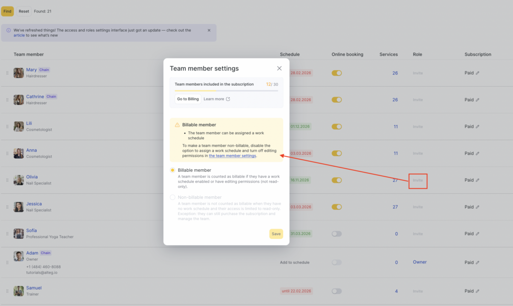 For administrators, owners, and other staff who do not provide services, linking a role to a service-providing team member is not required.