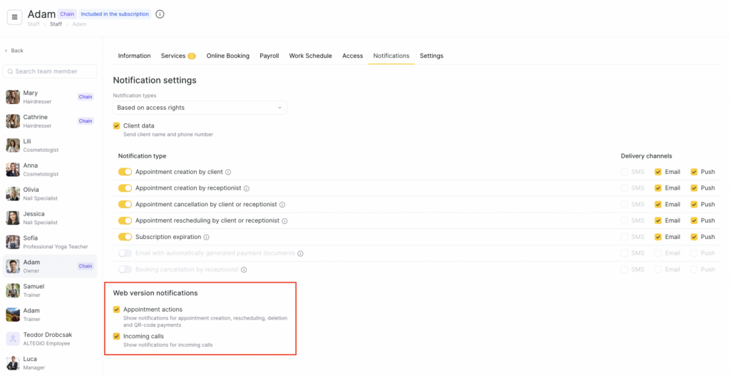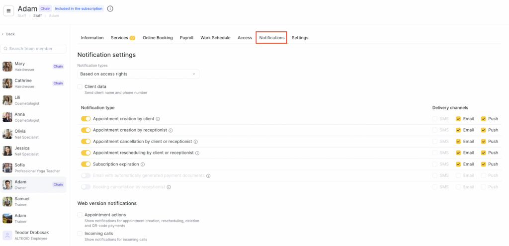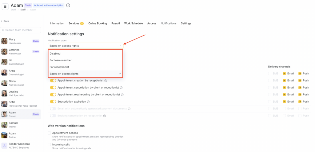 - Based on access rights — Altegio automatically determines the notification type based on the team member’s access rights.