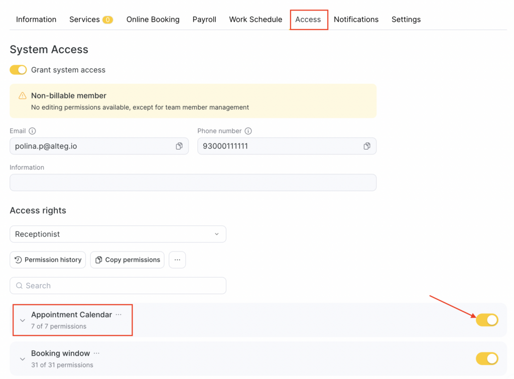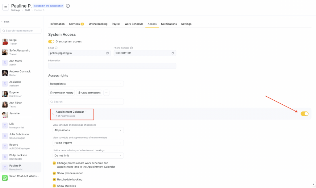 For example, a receptionist will be able to see schedule history without limits, while a service provider will not be able to see past appointments.
