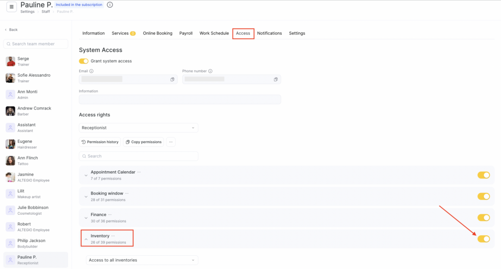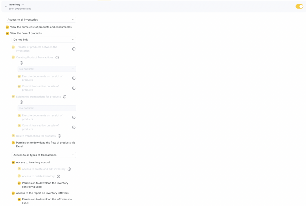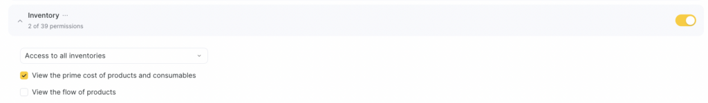- Find the required permission block and enable it using the toggle, then click the Inventory block name and turn on the specific permissions you want to grant to the team member.