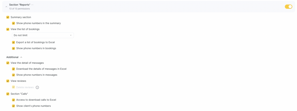 - Find the required permission block and enable it using the toggle, then click the “Reports” section block and enable the specific permissions you want to grant the team member.
