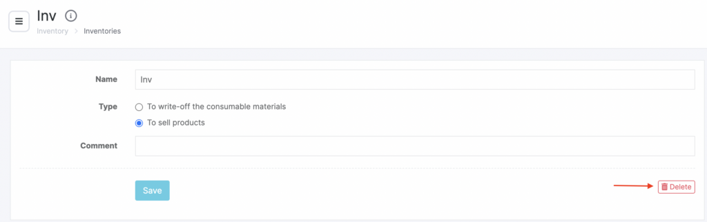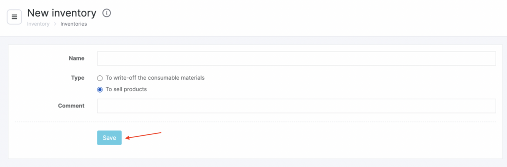 - In the window that opens, enter the Name, Inventory type (for writing off consumables or for selling products), and a Comment.