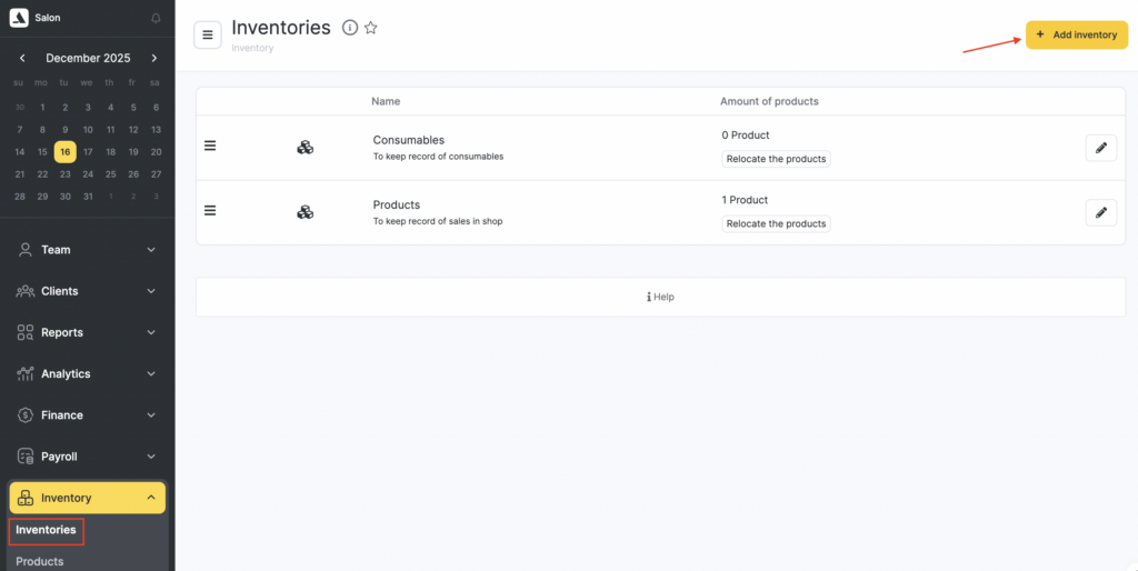 By default, Altegio has two inventories: Consumables and Products. You can add, configure, and delete inventories (for more details, see the Creating and setting up a new inventory article).