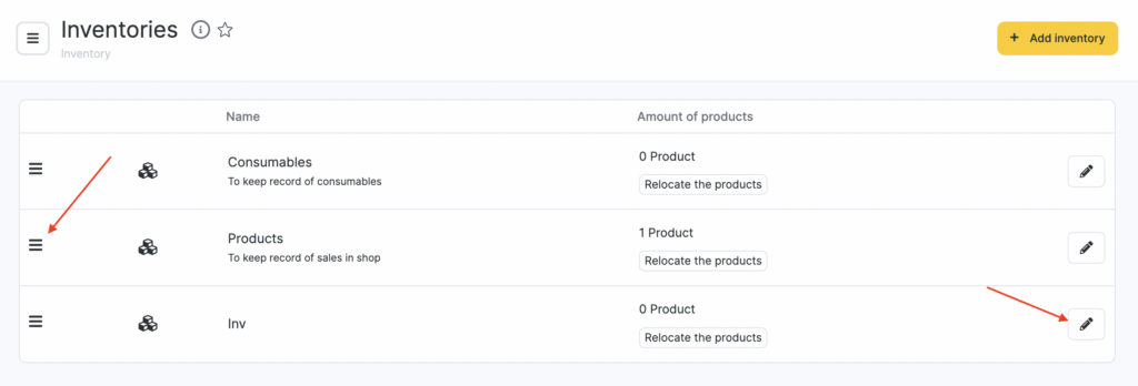 - You can reorder inventories in the list: click the three-line icon to the left of the inventory name and drag the row to the desired position. This order is used in the inventory list when selling a product or creating any inventory operation.