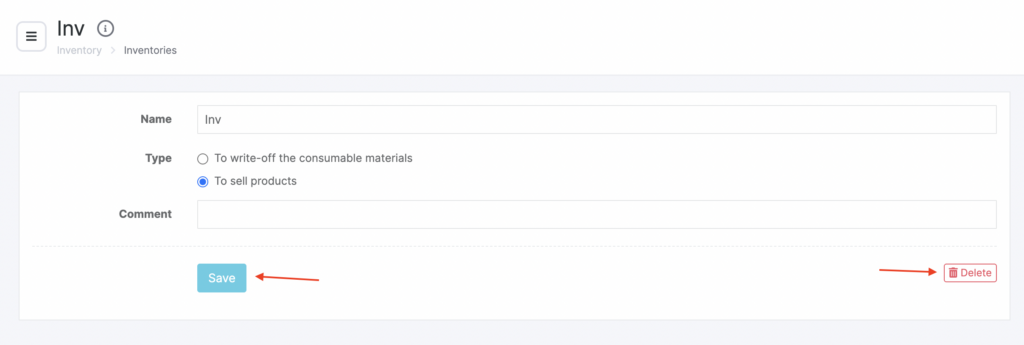 - You can edit information for any inventory. To do this, select the inventory and click its name or the pencil icon. In the window that opens, change the inventory name, type, and comment, then click Save. You can also delete the inventory here.