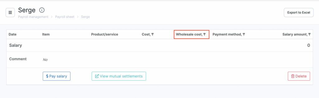 If the Include cost of consumables option is enabled in the team member payroll calculation settings, then when calculating payroll in Payroll > Settlements, the cost of consumables will be displayed.