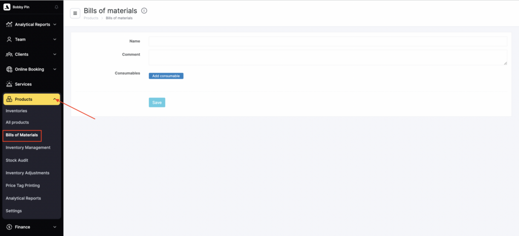 - Enter the bill of materials name and add a Comment.