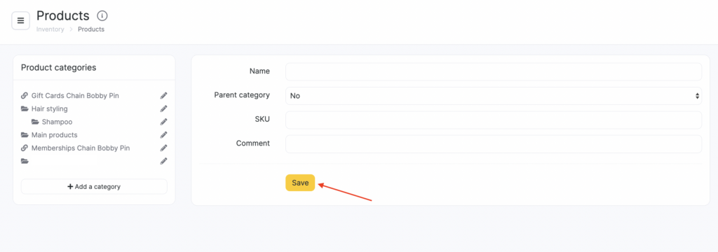 - In the window that opens, enter the Name, select the Parent category (the folder where this category will be placed), SKU, and Comment.