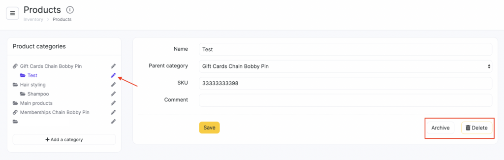 You can also delete or archive a product category here. Archiving lets you store unused items instead of deleting them permanently, and later choose whether to delete them permanently or restore them if needed.