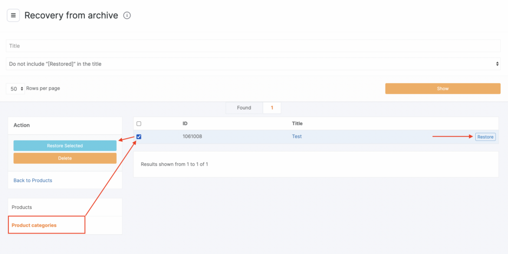 To unarchive or permanently delete a category, go to the Product archive tab. On the Product categories tab, restore categories one by one, or select multiple categories (check the boxes) and click Restore selected or Delete. To return to the product list, click Back to products.