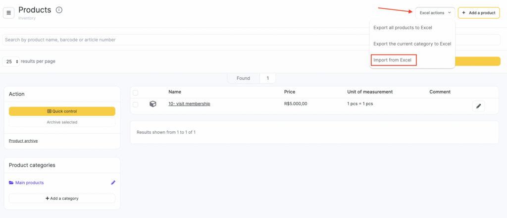 You can use this same process to update existing product data (for example, prices). To do that, export products to Excel via Excel actions > Export to Excel, then upload the same file back.Note that units of measure for products that already have operations can only be corrected manually.