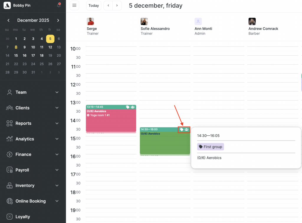 Once you have set up the categories, their icons will be displayed in the booking’s card on the Appointment Calendar. When you hover your cursor over the icon, you will see the name of the corresponding category.