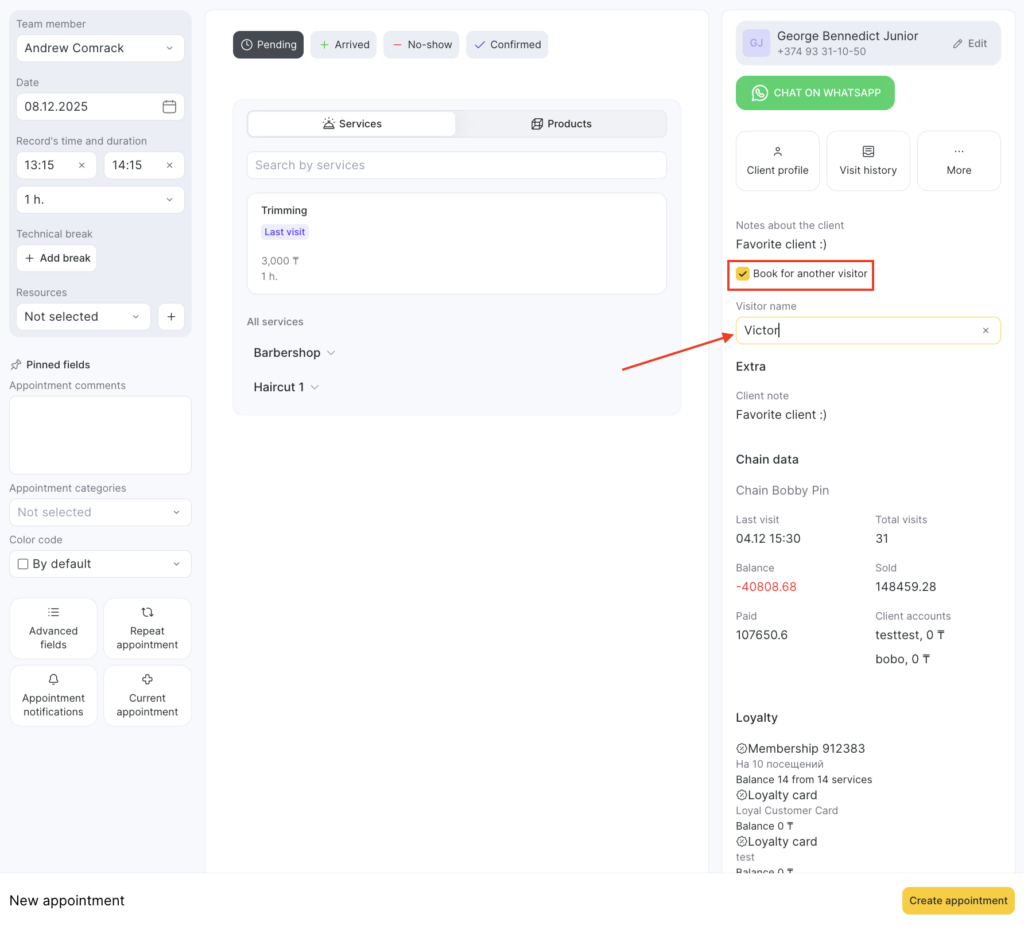 To remove a visitor from the visit, uncheck the “Booking for another visitor” field in the visit. The visitor will not be removed from the client’s card.