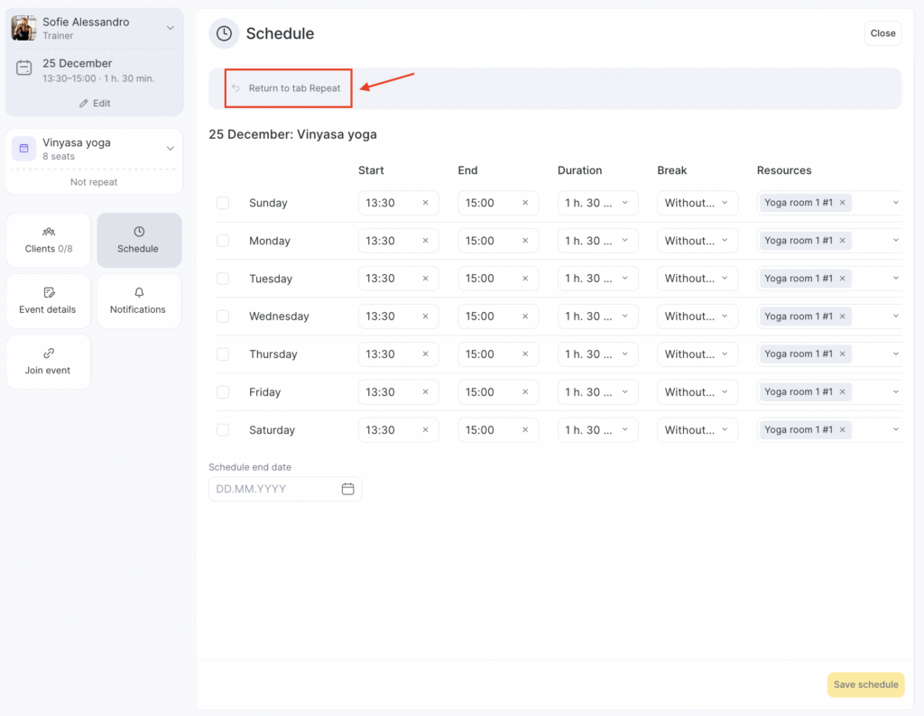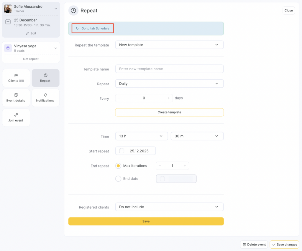 - Finally, if you have added clients to the event, you can check the “Add clients from the current event” option to include them in the schedule as needed.