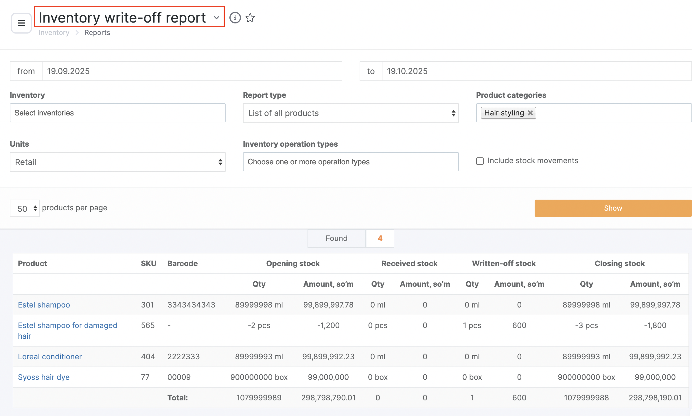 The report on the write-off of products can be viewed in the Inventory > Analytical Reports > Write-off Analysis section.