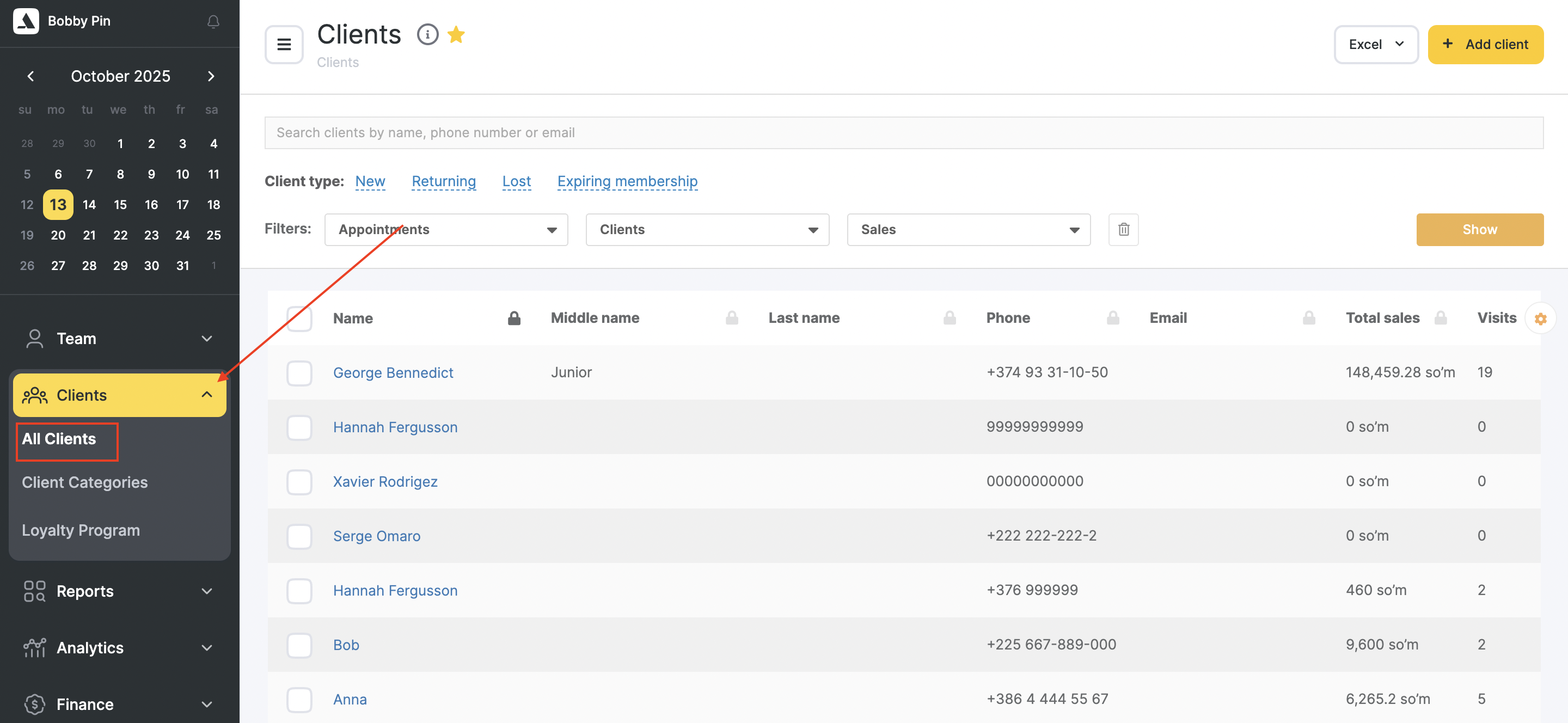 In the Clients — All Clients section, you can access information about all the clients who have ever visited your business. This list provides key information such as their names, contact details, total amount spent, discounts availed, number of visits made, and the dates of their first and last visit.