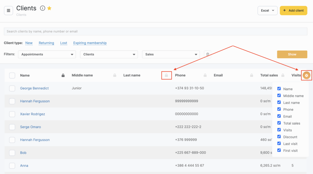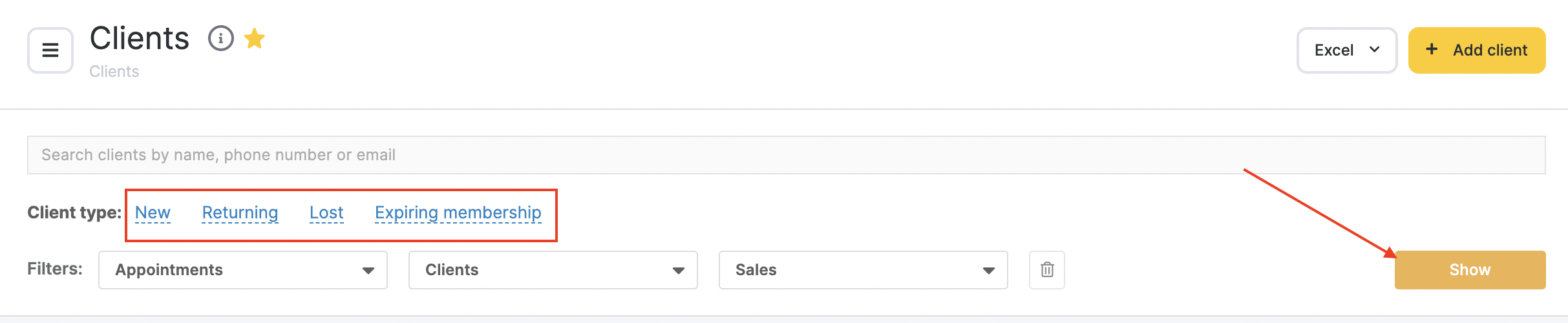 This feature is particularly useful when you need to identify clients who haven’t visited you in a while or those who bring in the most revenue. To search for specific clients, simply enter their name, phone number, email address, or card number in the search bar and click the “Show” button. This will help you quickly locate the desired information in your All Clients section.