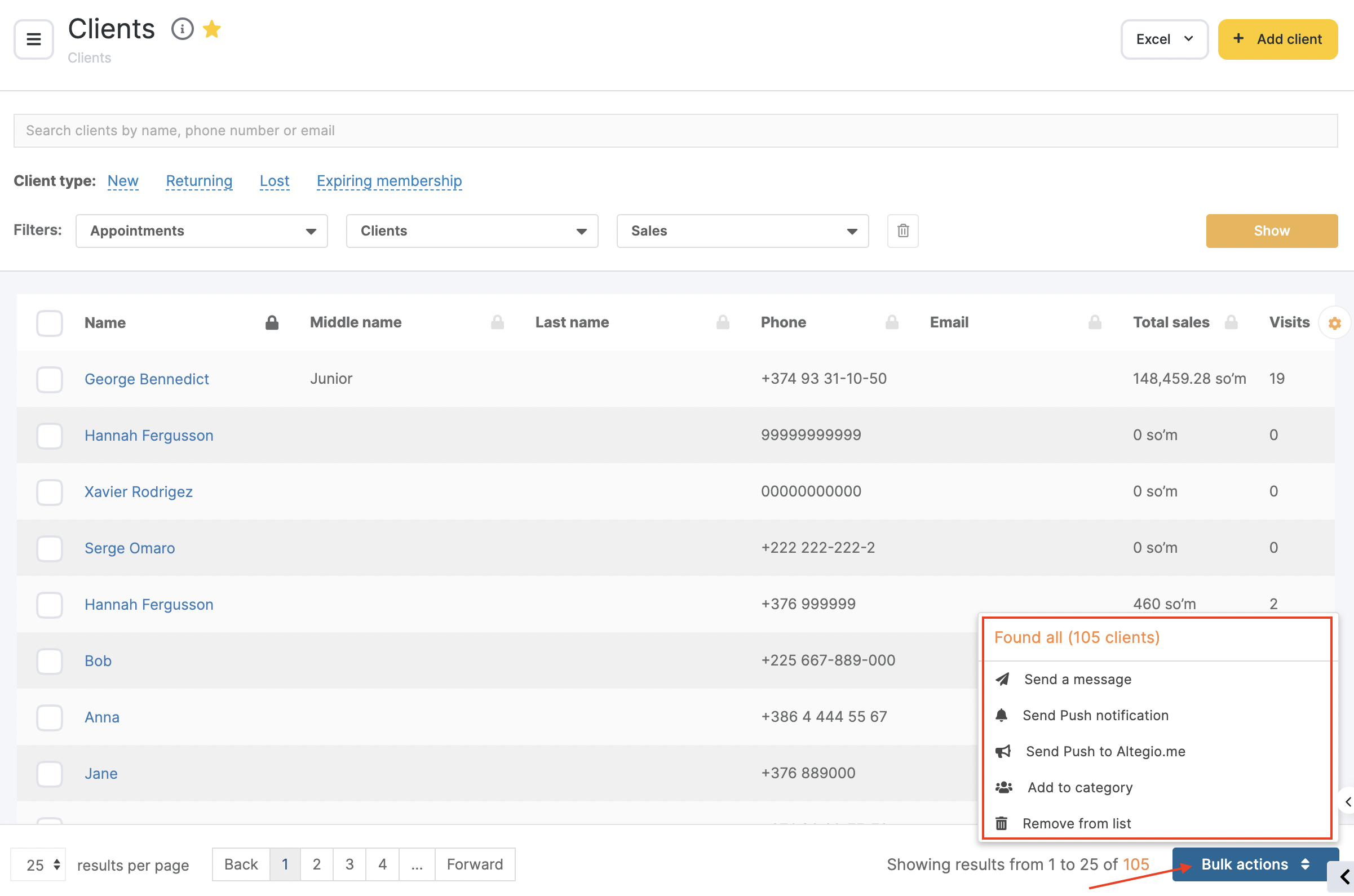 Using the All Clients section you can perform mass mailing, send notifications, delete clients from the database, add clients to categories and download information as Excel spreadsheet.To perform an action for all clients just click the “Bulk actions” button and select the option you want from the list.