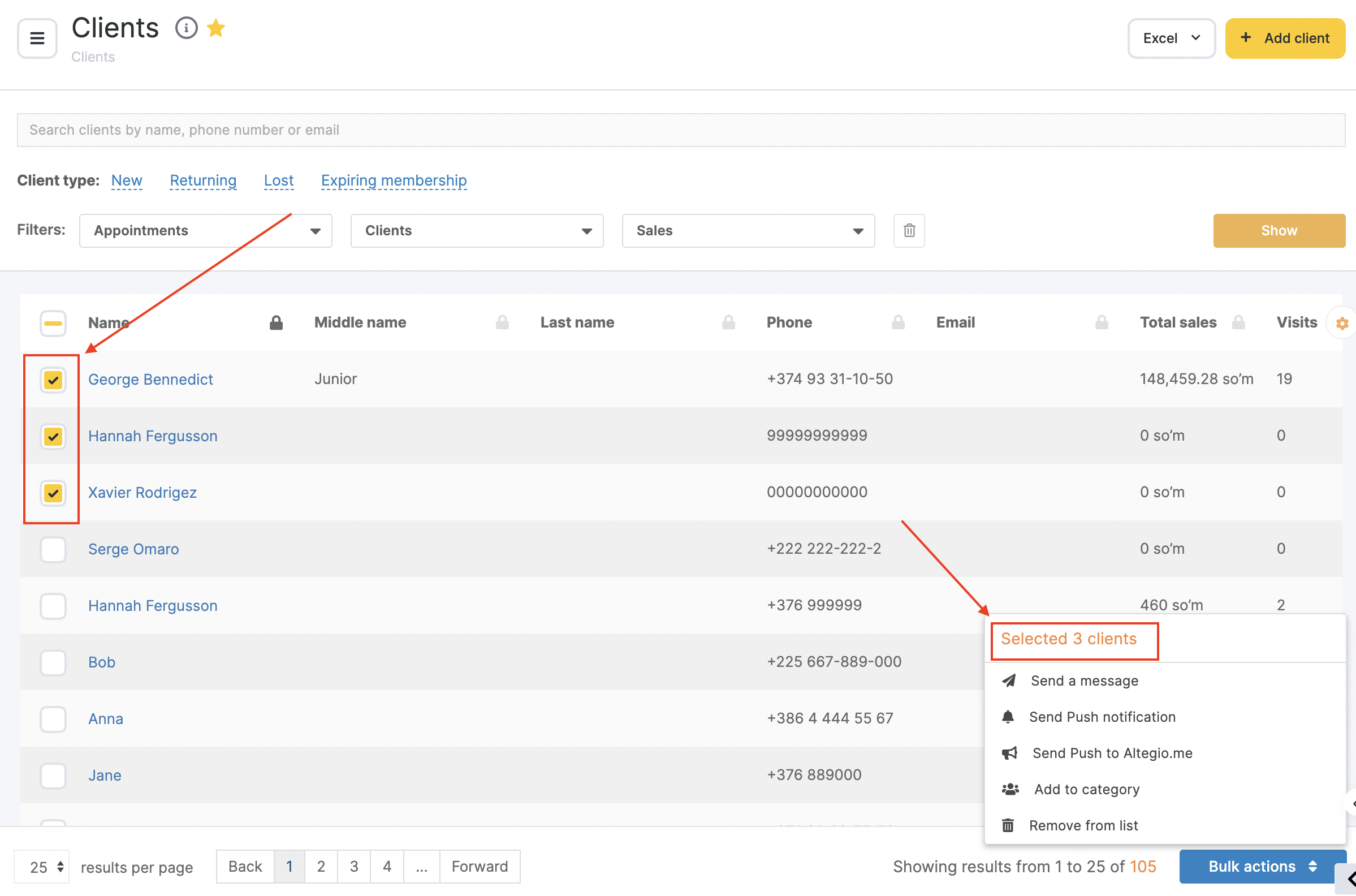 You can perform actions with all clients in the list or just the selected ones. To select a certain client check the box next to their name and after that all actions will be performed only for clients you selected.