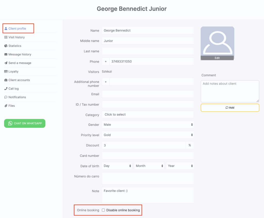To add a client to the blacklist in the online booking system, go to Clients → Client database, select the desired client, and check the box “Disable online booking.”