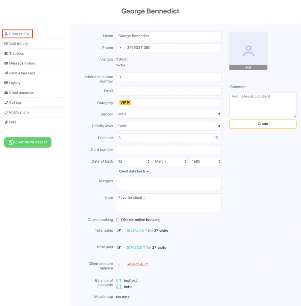 In the client’s card, you can access sections that contain all the information you have on the client, such as personal details, booking history, appointment details and more.