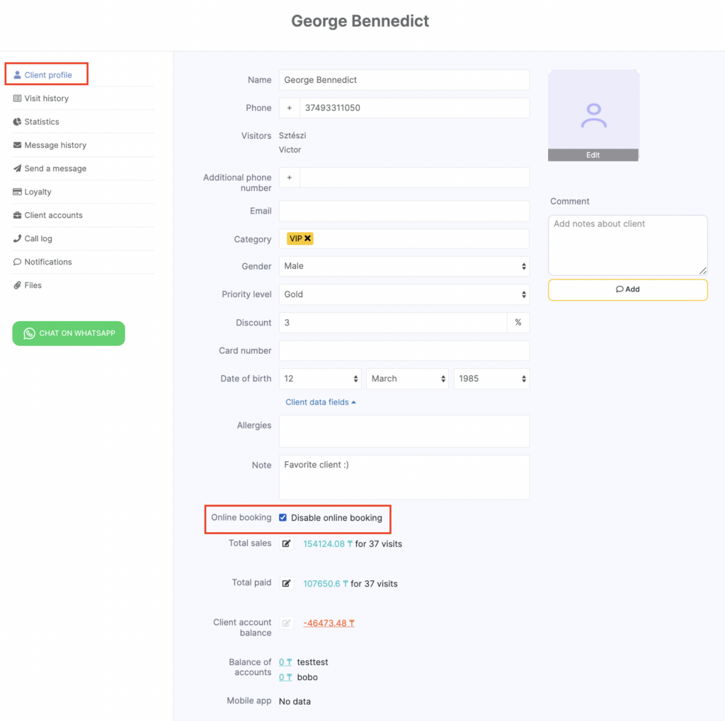 To add a client to the blacklist in the online booking system, go to Clients > All Clients, select the desired client, and check the box “Prohibit online booking.”