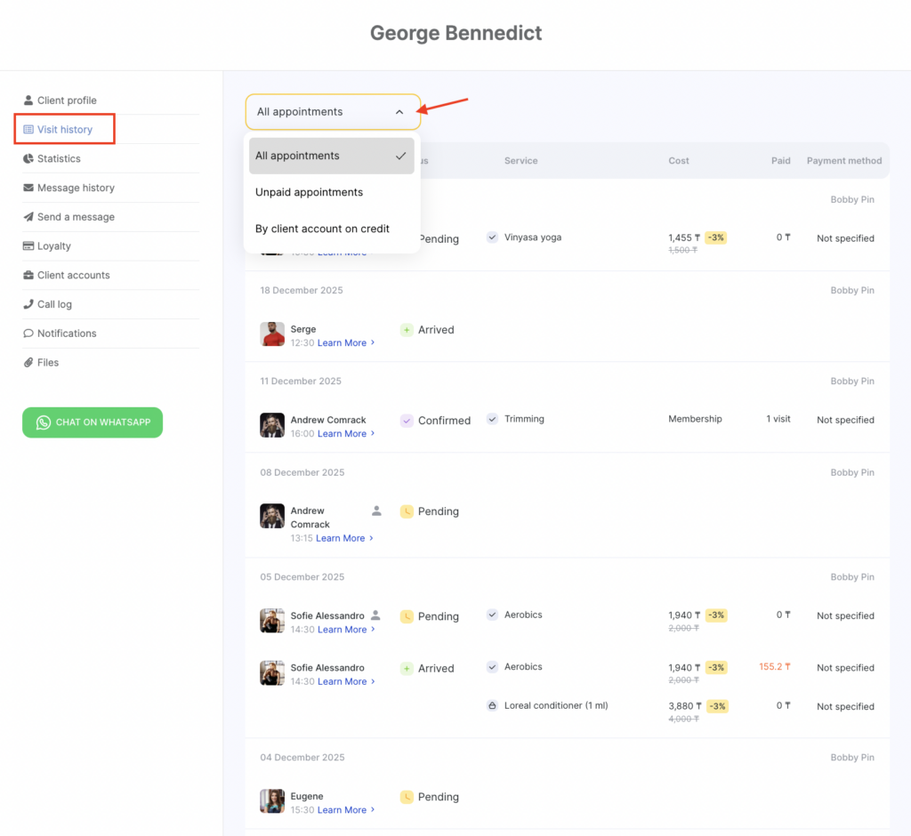 Using the drop-down list at the top, you can filter your browsing history by type—choose to show all appointments, only unpaid ones, or those with a debt.