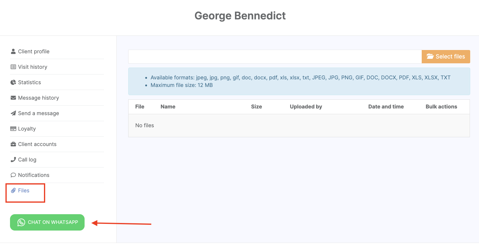 You can also quickly access the chat on WhatsApp from the client’s profile by clicking the green “CHAT ON WHATSAPP” button. This will open WhatsApp Web, allowing you to immediately message the client.