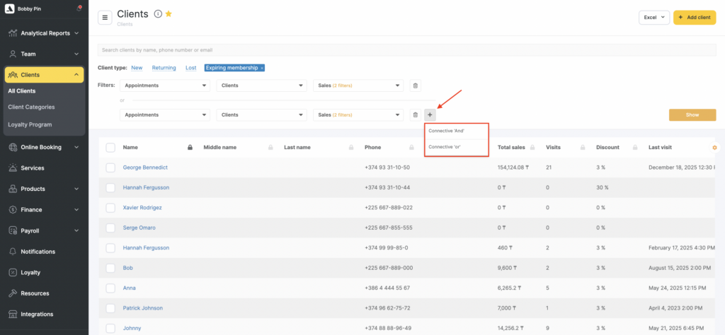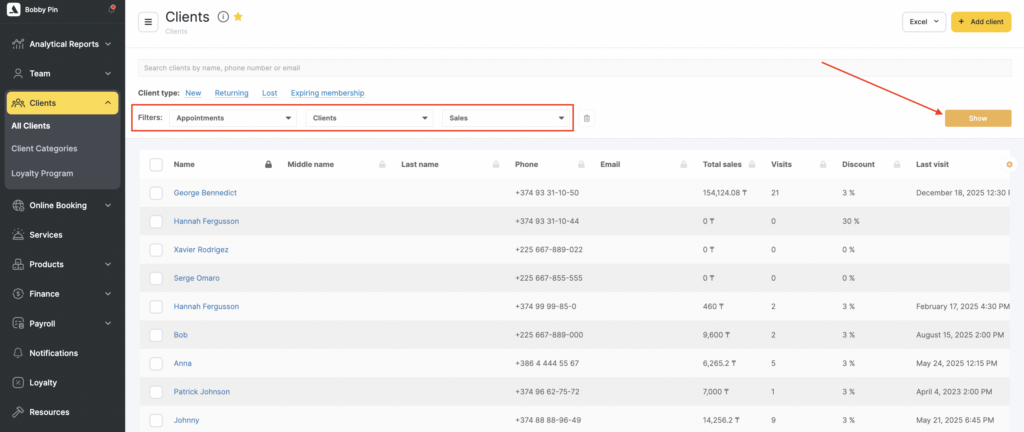 - Cost of provided services: This filter will help you find clients who spend more than the average amount during their visits.