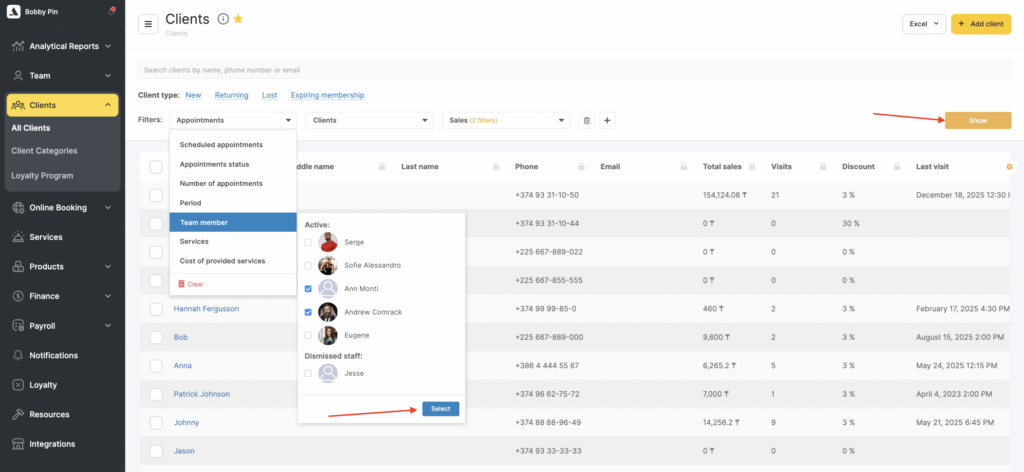 - Employee: This filter will help you find clients who have made bookings with a specific employee.