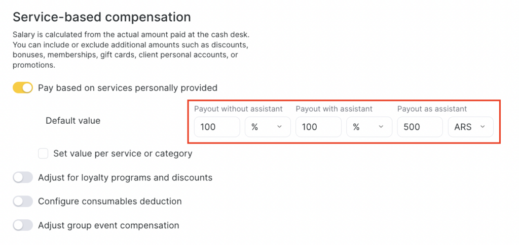 If you enable the adjustment, the payroll calculation will use the full service price, without reducing it for the client’s discount, bonus payments, gift cards, promotions, or memberships.