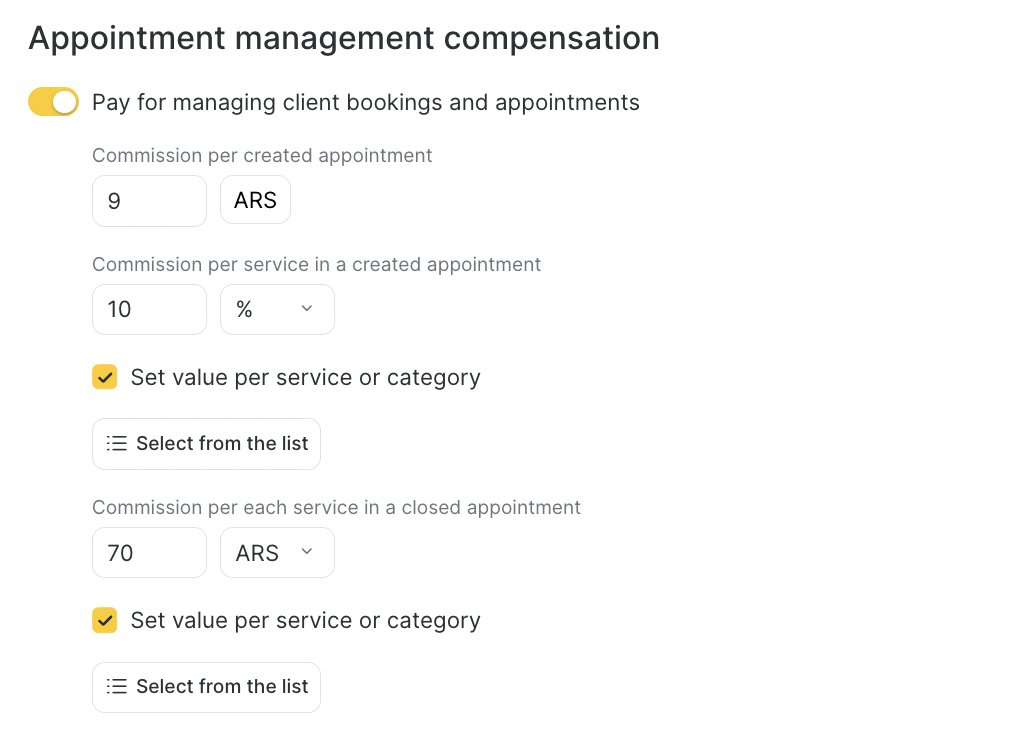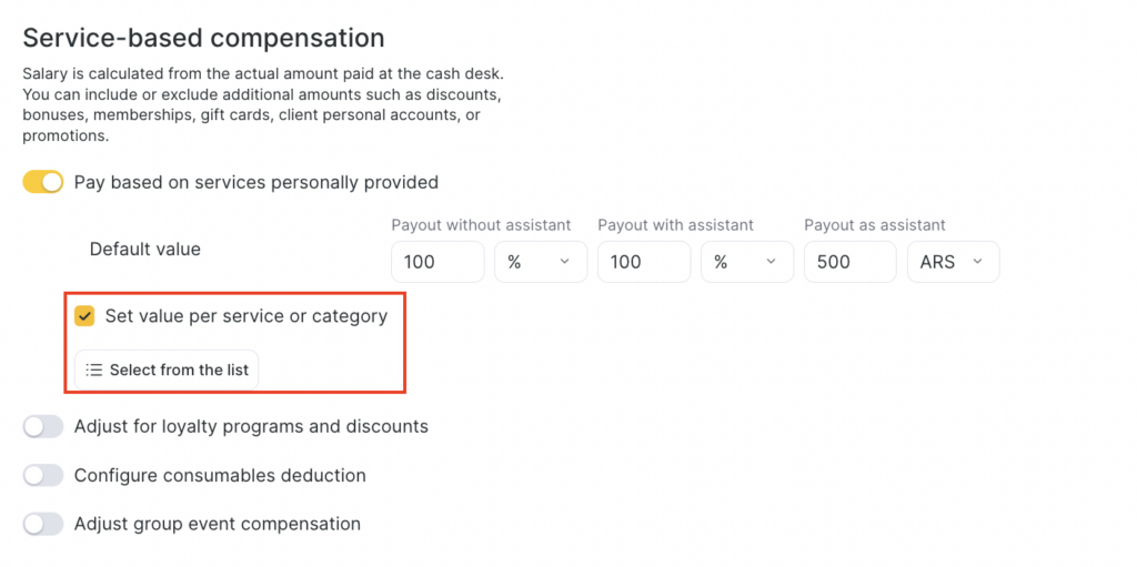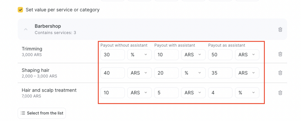 To assign a separate value for an entire service category, click Select from the list, choose the required category, and check All services. After that, a field will appear where you can enter a percentage or fixed amount — this value will apply to all services within the selected category.