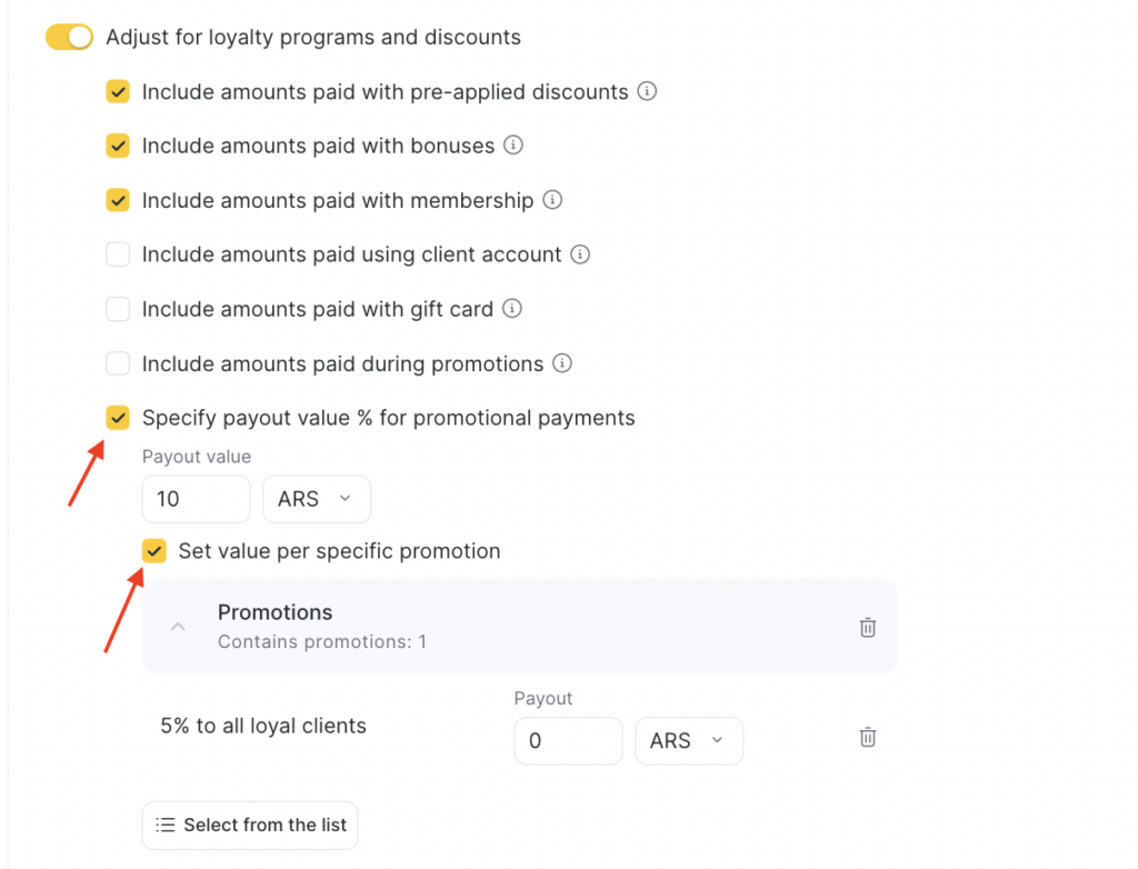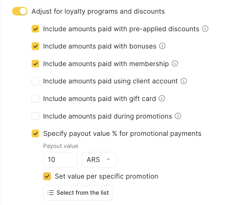 This section lets you configure which amounts should be included when calculating employee compensation if a client uses discounts, bonuses, memberships, or participates in promotions.