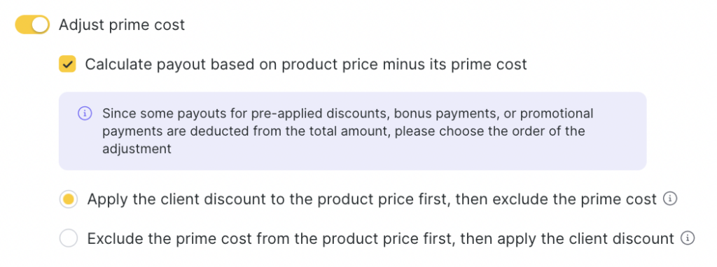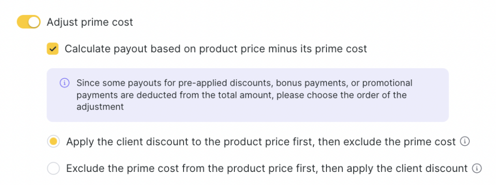 The system also allows you to choose the order of application. To do this, enable Calculate payout as the difference between the product price and its cost price and select the order: