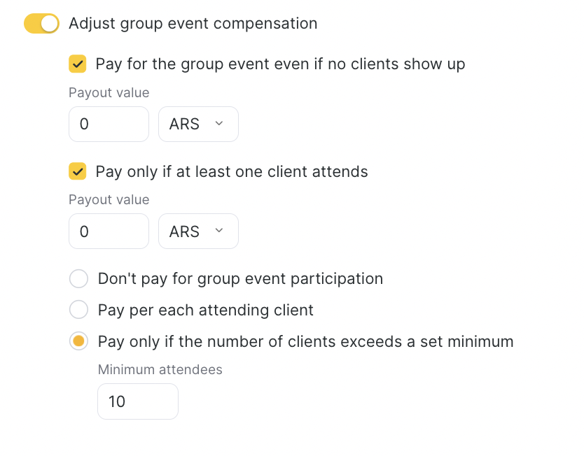 If your team runs group sessions (for example, workouts, master classes), enable compensation settings for group events.