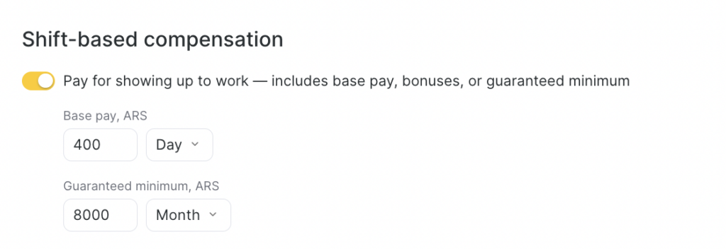 Set a guaranteed minimum per day/month — the amount the employee will receive in any case, even if the base salary plus percentages is less than the minimum. Useful during low-load periods.