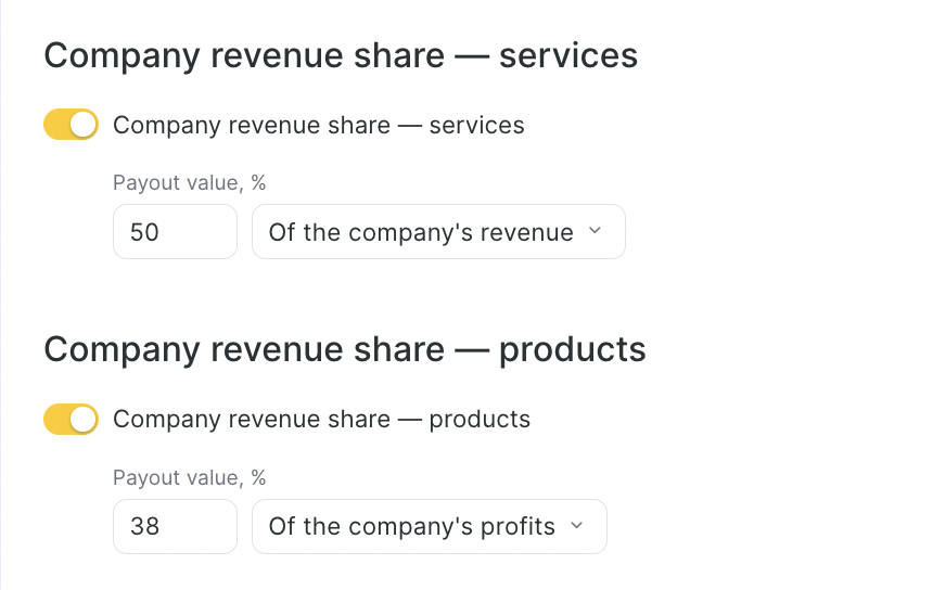 - Set a percentage of the product price (%) or a fixed payout amount. As with services, you can set one percentage/amount for all products or set separate values for specific categories or specific products.
