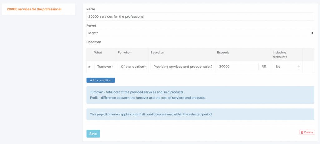 month or day (if the period is set to month, profit or turnover will be calculated starting from the 1st day of the calculation month). - Set the Conditions under which certain payroll calculation rules will apply (more details here). Select the options that define how the rule will be applied: