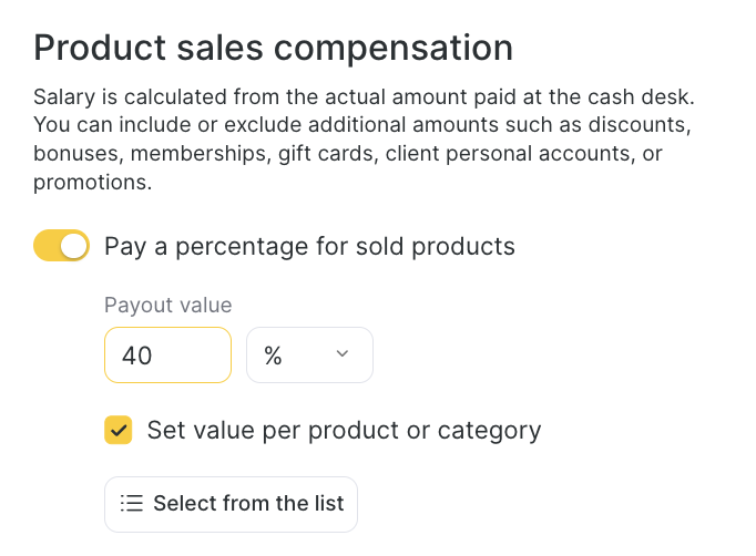 - In the Products block, set the percentage from sales (you can configure it separately by products/categories).
