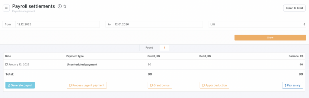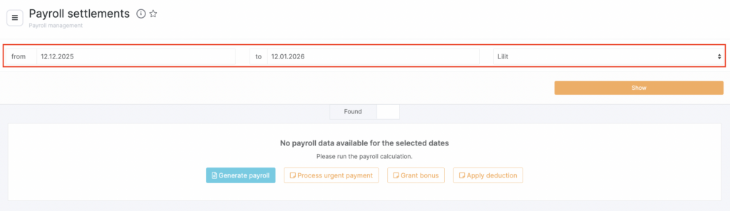 In Payroll calculation > Settlements, you can see all transactions related to salary accruals and salary payouts to team members. To view these details for a specific team member, select the period and the team member, then click Show.