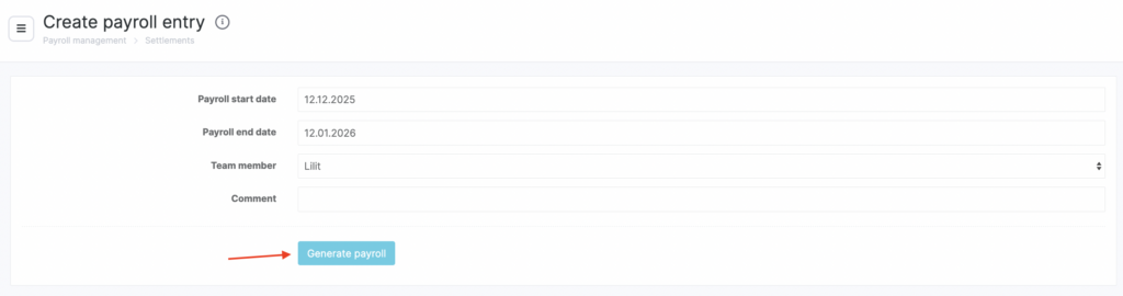 - To accrue salary, go to Payroll > Settlements and click Generate payroll.