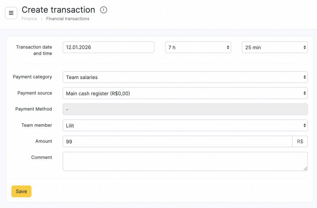 - In the new window, set the payment date and time, choose the payment category (the category Payroll is set automatically), select the cash desk the funds will be withdrawn from, and choose the team member receiving the salary.