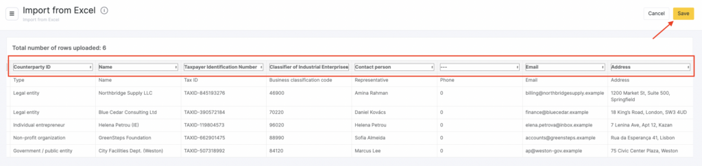 - In the new window that opens, match the data to the table headers: Name, TIN, KPP, Contact person, Phone, Email, Address, and Comment.