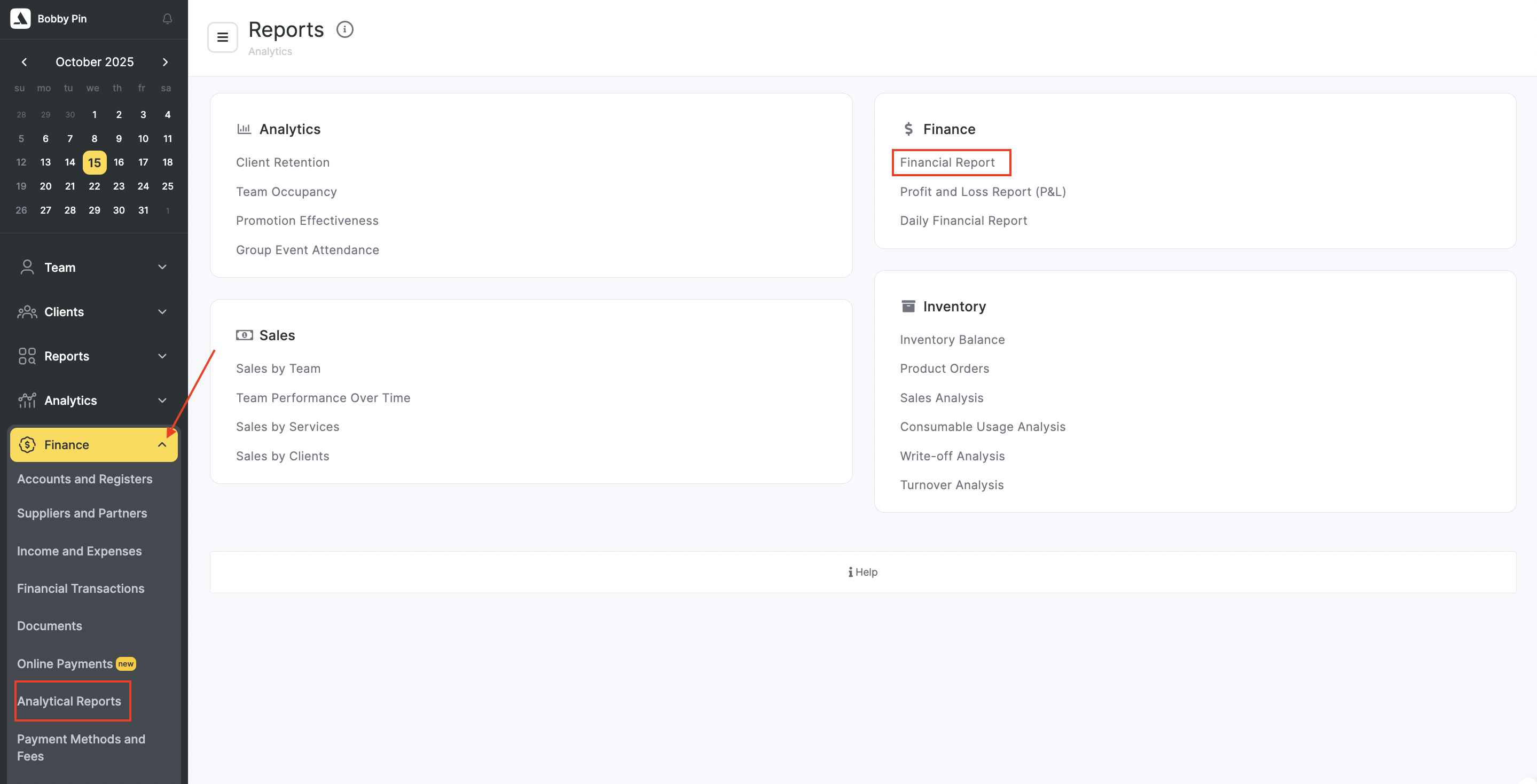 To access the financial report, navigate to the Finance – Analytical Reports – Financial Report (or Analytics – Analytical reports – Finance) section.